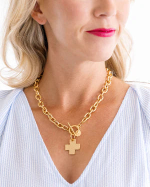 Immerse yourself in the elegance of the Gold Cross Front Toggle Necklace by Susan Shaw. This pendant charm necklace, inspired by Northern European styling, is a testament to over three decades of refined jewelry design.