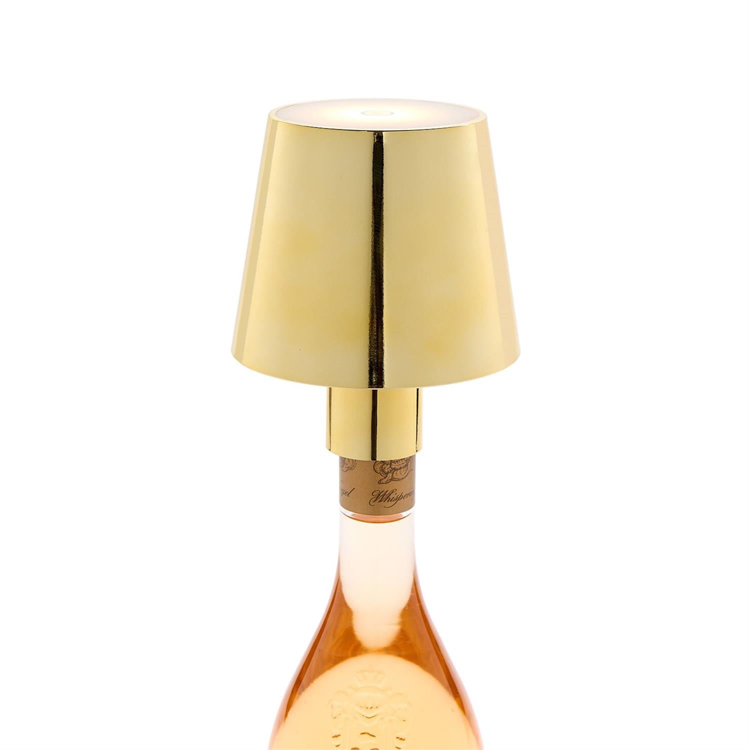 LED Portable Cordless Gold Lampshade Bottle Lamp with Stopper Attachment in Gift Box (fits most wine bottles, 2200 Mah rechargeable battery, USB cable, 2 interchangeable adapters, 1 silicone cylinder, 2 silicone rings included, 3 color stepless dimming, LED settings: warm white, cool white, day light) - Iron