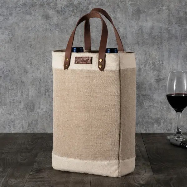 Picture yourself entering the wine and cheese party with two fabulous bottles of wine securely held in this rustic-chic insulated wine tote. It’s a very nice picture. With stylish and durable jute and vegan leather construction, this wine carrier bad features full insulation and a protective inner barrier to protect the wine. At 11.5 by 7.25 by 3.25 inches, it’s the perfect size for two standard bottles, or one bottle and some yummy picnic items. Makes a lovely hostess gift for a friend - or yourself!