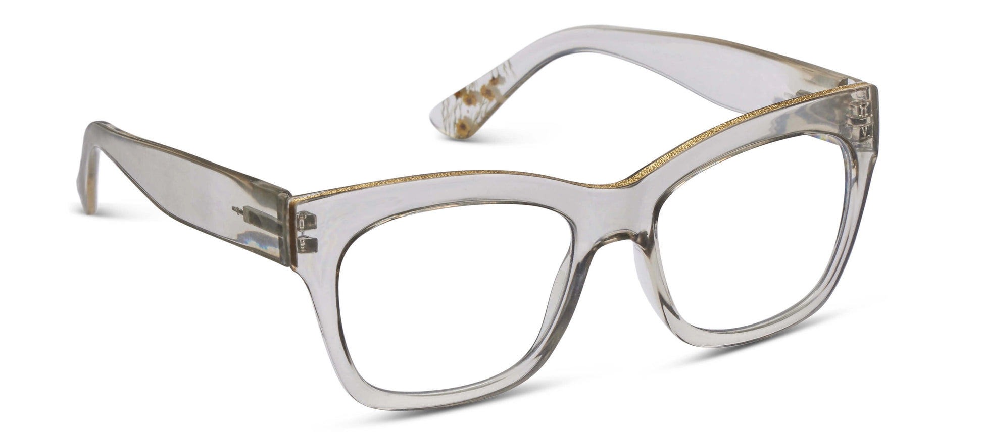 Soulful Style. Marigold elevates a neutral classic to a free-spirited statement piece. The soft square frame offers a flattering shape enhanced by a gold accent across the top. A subtle flower feature carefully embedded in the temple creates an unexpected feminine touch.