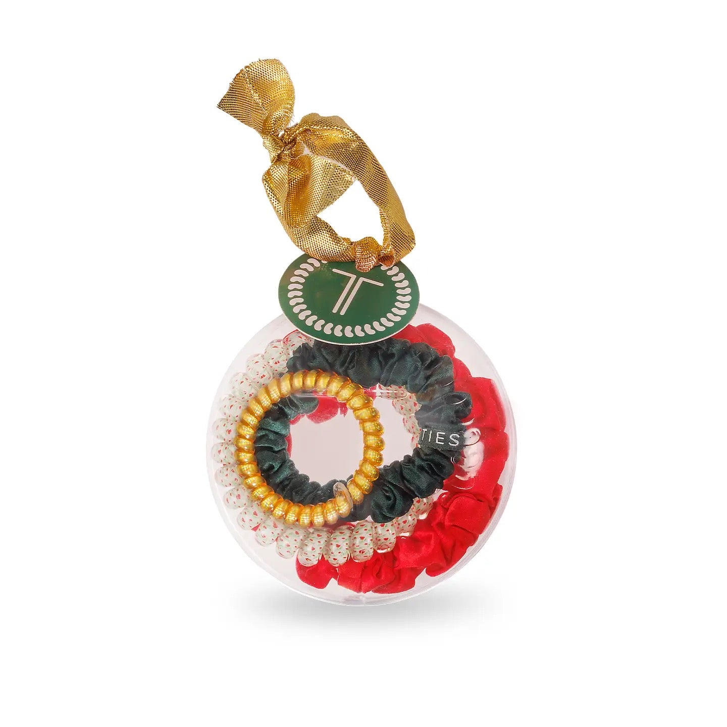 Add some holiday charm to your tree with our TELETIES Holiday Ornament! This festive bundle Includes an acrylic ornament with an exclusive mixed TELETIES pack inside! It’s the perfect eye-catching decoration that doubles as a thoughtful gift to spread some Christmas cheer! This pack features 1 large silk scrunchie, 1 small silk scrunchie, 1 large hair tie and 1 small hair tie!